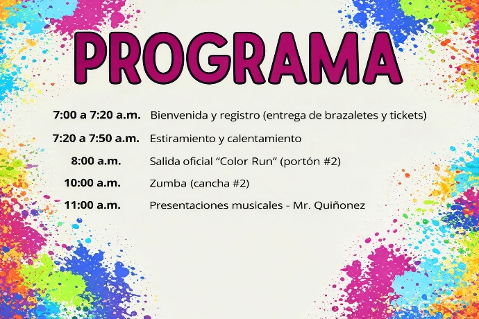 Este año, por primera vez, celebraremos además un Color Run Familiar, una actividad recreativa que promoverá la alegría, el trabajo en equipo y la vida saludable. Más que una carrera, será una experiencia de integración donde padres, hijos y familiares podrán compartir momentos significativos en un ambiente lleno de energía y color.